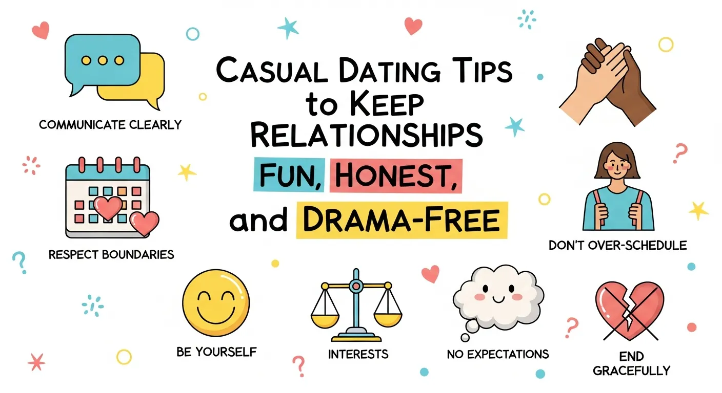 The most important casual dating tips are to be honest about your intentions, manage your schedule responsibly, and always treat the other person with respect. Open communication prevents people from getting hurt. Check out this dating tips for beginners complete guide to learn the basics.